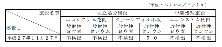 - エコシステム花岡及びグリーンフィル小坂について、放射性ヨウ素、放射性セシウムのいずれも検出されなかった。