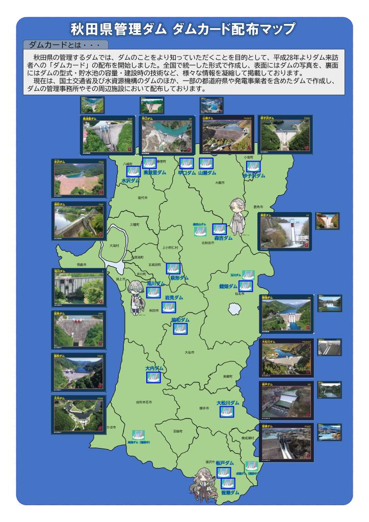 秋田県管理ダムのうち、森吉ダム、皆瀬ダム、旭川ダムのキャラクター入ダムカードを枚数限定で配布します。