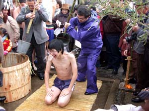 毎年1月第3日曜日に行われる小正月行事。早朝、水垢離を取り、白鉢巻きに白腹巻き、白足袋に草鞋のいでたちで「ジョヤサ(除夜叉)、ジョヤサ」のかけ声とともに、町内あるいは会社が1組になって、148mの山頂にある新山神社を目指し、身体堅固、家内安全、五穀豊穣などを祈願する。「裸まいり」は、天保(1830~44)の頃に起こったともいわれるが、定かではない。新山神社には古くから修験者が住んでいたと伝えられ修験道の荒行が姿を変えて伝承されたものといわれている。真冬の奇祭として全国的に有名である。