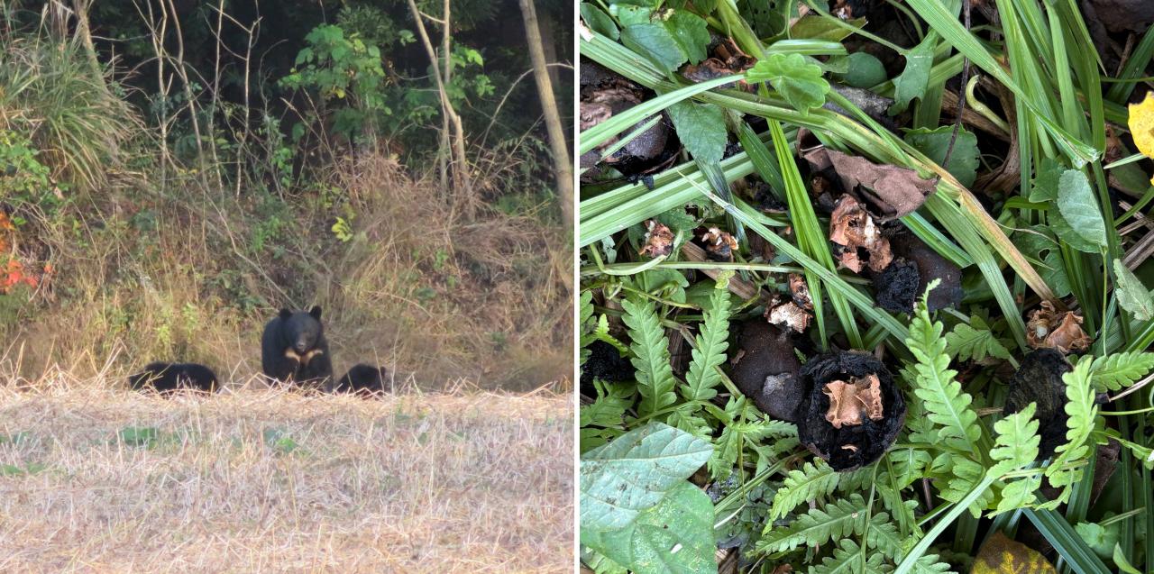 (左)畑にソバの実を食べに来た親子グマ