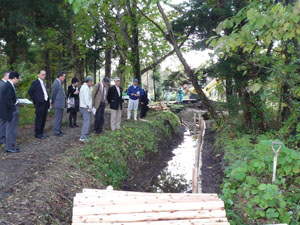 まず、保全会の佐藤副会長の案内により、遊休農地を活用した花の植栽、間伐材を利用した水路の補修、農道や水門の補修等の状況について、活動区域を歩きながら視察を行いました。水路の補修については、当日もリースした重機を使用した作業が行われていました。この対策により、ほ場整備の地区外で崩壊が著しくなっている水路の補修が可能となり、大変助かっているとのことでした。