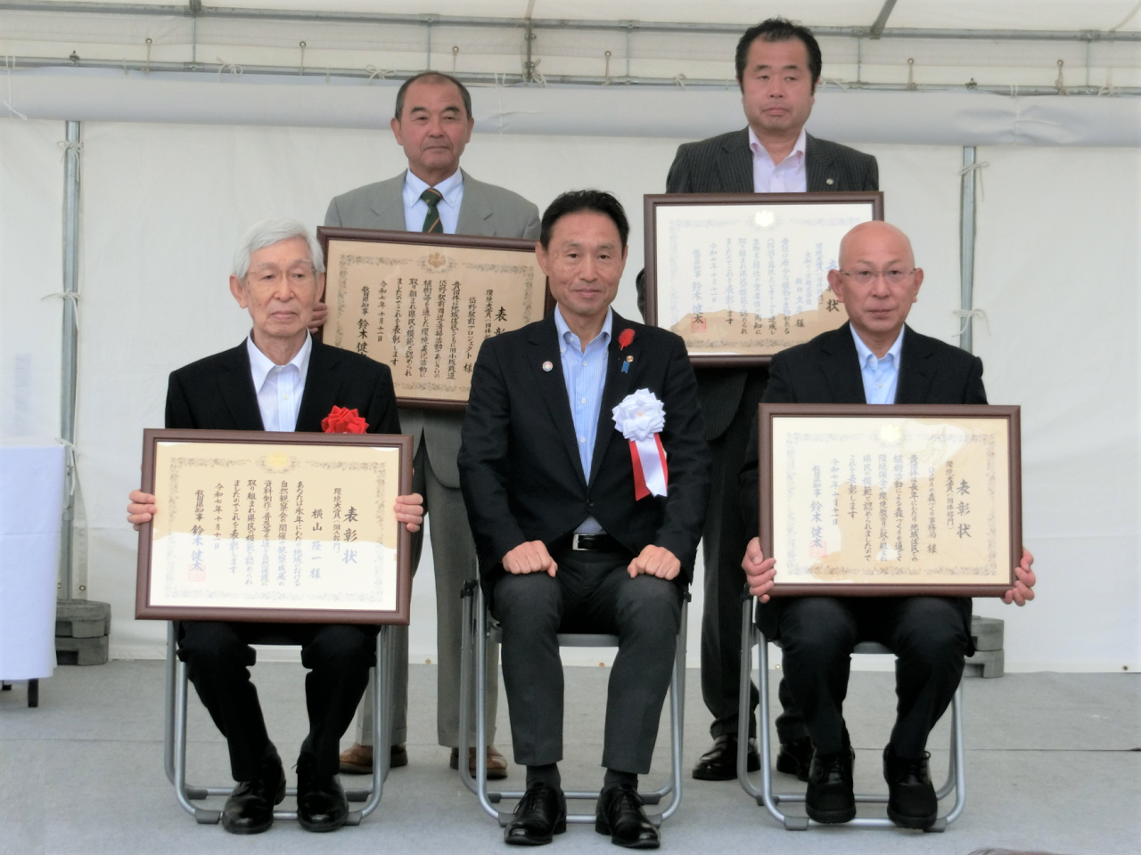 横山 隆一様(前列左)、神部(じんぶ)副知事(前列中央)、DOWAの森づくり事務局(前列右)、