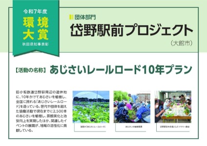 旧小坂鉄道岱野駅周辺の遊休地に、10年かけてあじさいを植樹し、全国に誇れる「あじさいレールロード」を造っている。世代や団体を超えた協働活動で現在までに2,500本のあじさいを植樹し、景観美化と治安向上を実現したほか、関連したイベントの展開が、地域の活性化に貢献している。