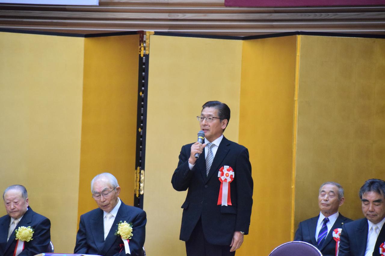 表彰式では、地方自治功労者11名の方々に表彰状と洋銀杯が贈られました。自治功労者を代表して近藤健一郎様より御挨拶をいただきました。