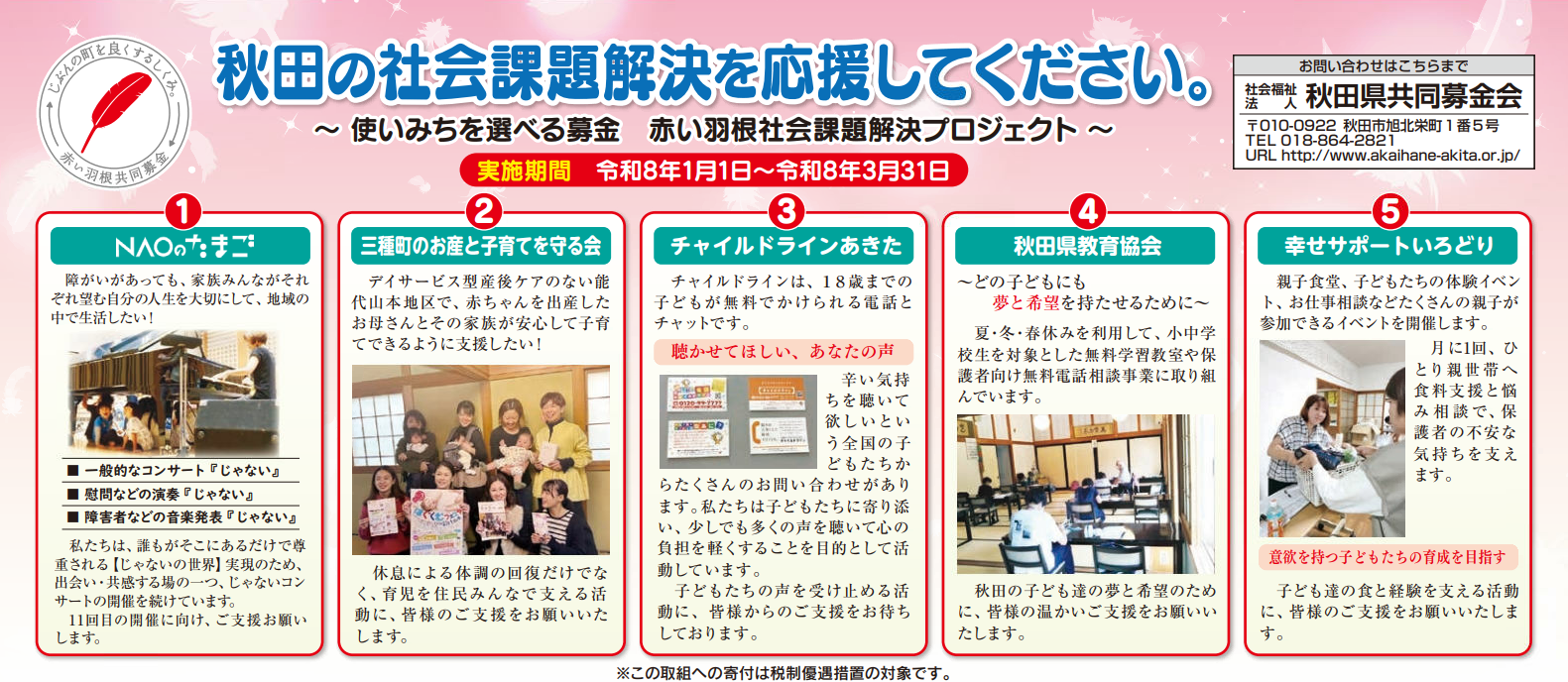 詳細については、秋田県共同募金会にお問い合わせください。