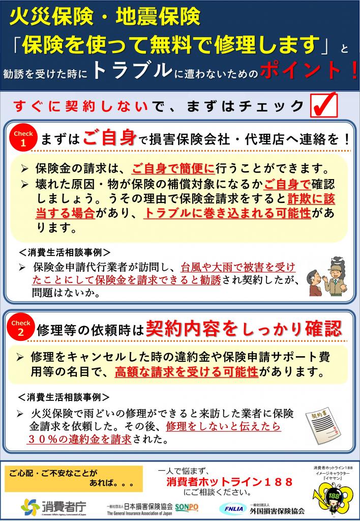 保険金で住宅修理ができると勧誘する事業者に注意!-申請サポートを受ける前に、損害保険会社に連絡を 保険金の請求は、加入者ご自身で!!-(国民生活センターHP)