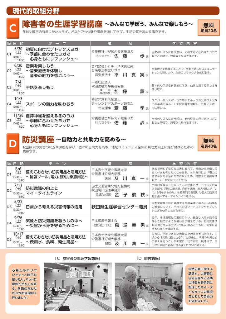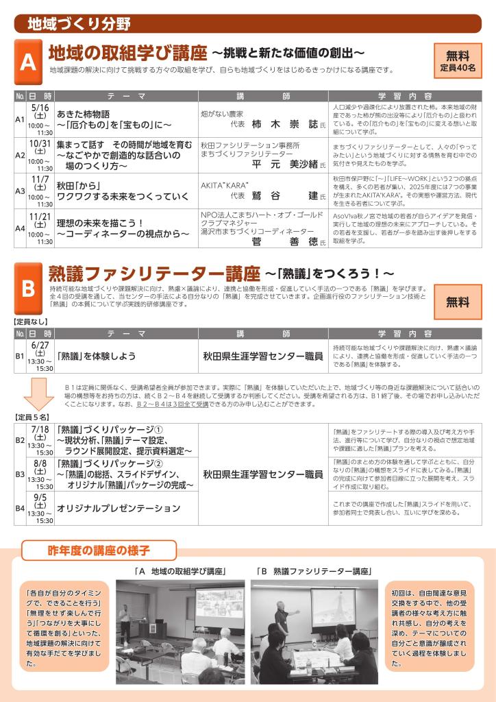 令和8年度あきたスマートカレッジ「学習案内」 コンテンツ番号:80040 更新日:2026年03月20日 地域づくり分野、現代的取組分野、教養分野をラインアップ! 令和8年度に開講するあきたスマートカレッジのテーマ、講師や学習内容を一覧できる学習案内を紹介します。今年度のスマカレも、地域課題や現代的課題などを学ぶことができる講座を準備しました。 ⇒ダウンロードファイルはこちらです。[2332KB]