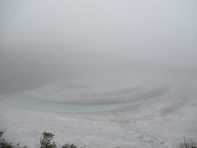 写真手前側の雪が盛り上がってきています。曇りの日だと、霧やガスなどで全体的に見通しが悪いので、お越しになる際は十分にお気をつけください。