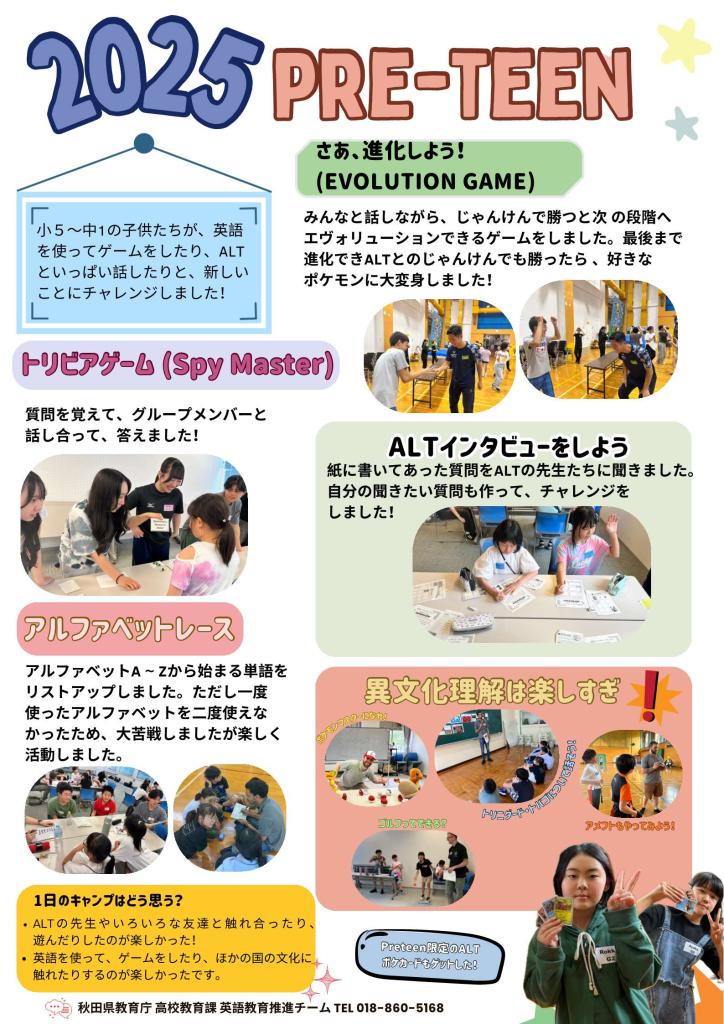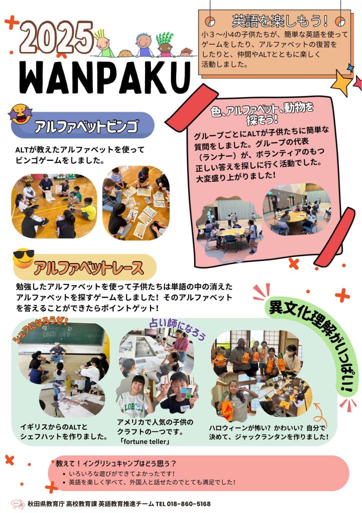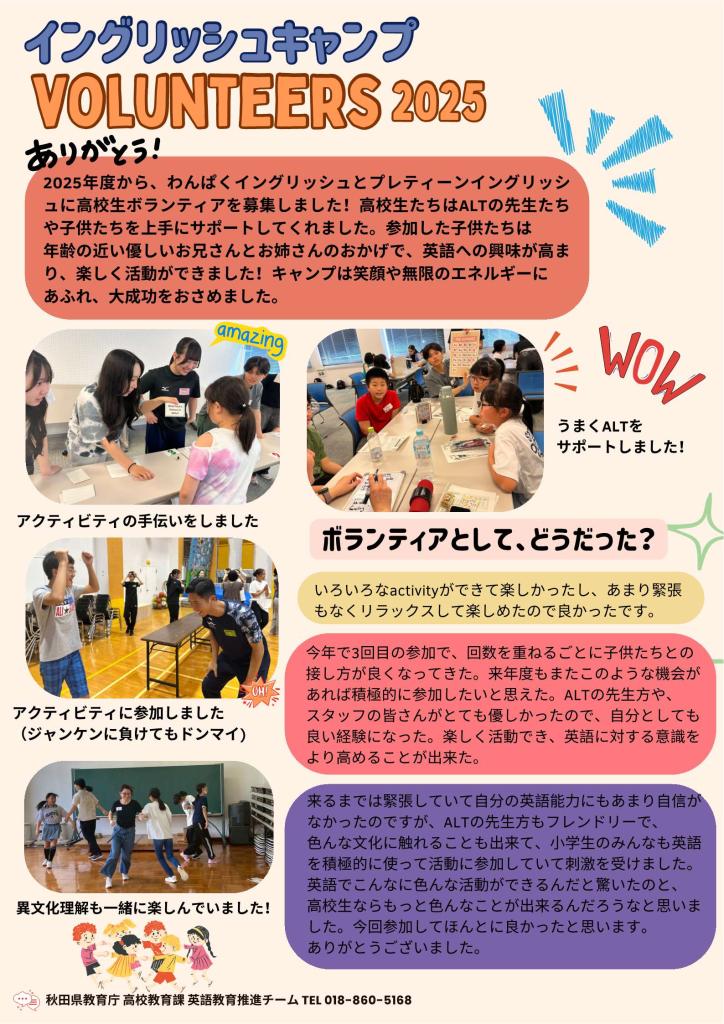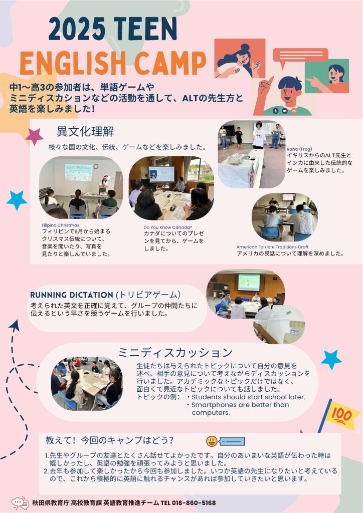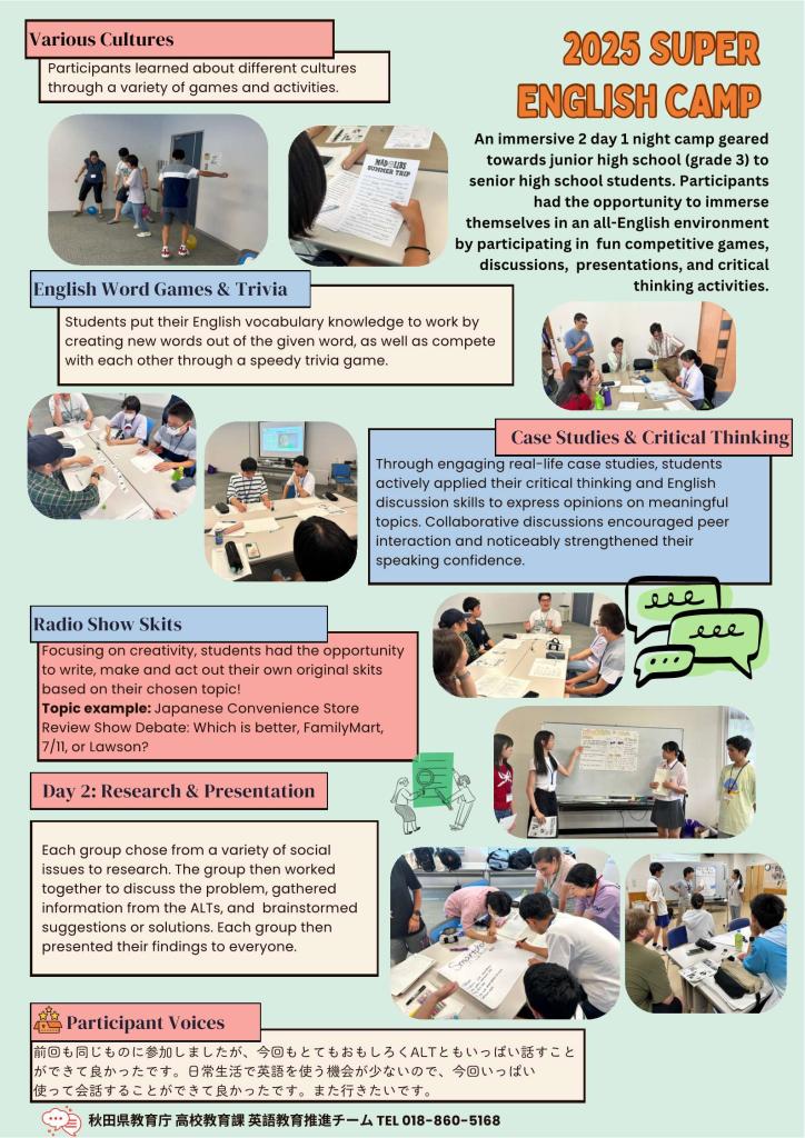 イングリッシュキャンプ(EC2025) コンテンツ番号:8171 更新日:2025年04月15日 令和7年度イングリッシュキャンプについて(今年度は終了しました。) 令和7年度English Camp のまとめ⇒ [155KB][151KB][124KB][161KB][166KB][152KB][159KB] イングリッシュキャンプ募集要項の画像データ⇒[6582KB] イングリッシュキャンプ募集要項PDF⇒[256KB] イングリッシュキャンプFAQ ⇒[137KB] イングリッシュキャンプの参加及び高校生のボランティアのご協力をお願いします ★ファンライティングのHPはこちら 平成28年度イングリッシュキャンプの様子