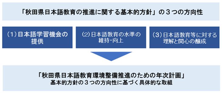 この年次計画は、秋田県の日本語教育環境整備推進の指針である「秋田県日本語教育の推進に関する基本的方針(令和