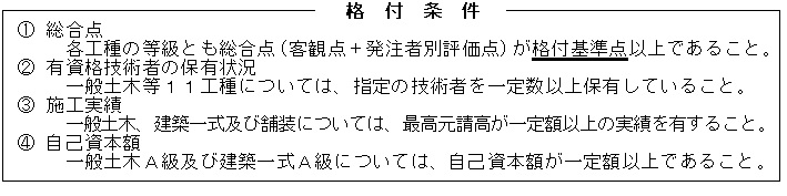 次の最低要件を全て満たす者のうち、総合点が一定点(格付基準点)以上の者について、入札参加資格を認めています。