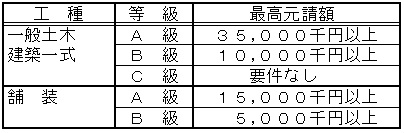一般土木、建築一式、舗装の格付工種については、各等級別に、次の表に掲げる金額以上の元請工事の施工実績を有していることが必要です。