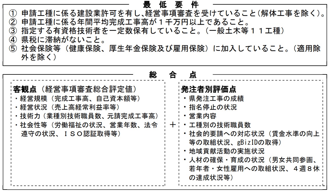- このうち、県内建設業者については、建設業の許可等の最低要件を満たす者のうち、建設業法に基づく経営事項審査による点数(客観点)に、県発注工事の成績や指名停止等の状況による点数(発注者別評価点)を加算して得た点数(総合点)が一定点数以上の者について入札参加資格を認めています。