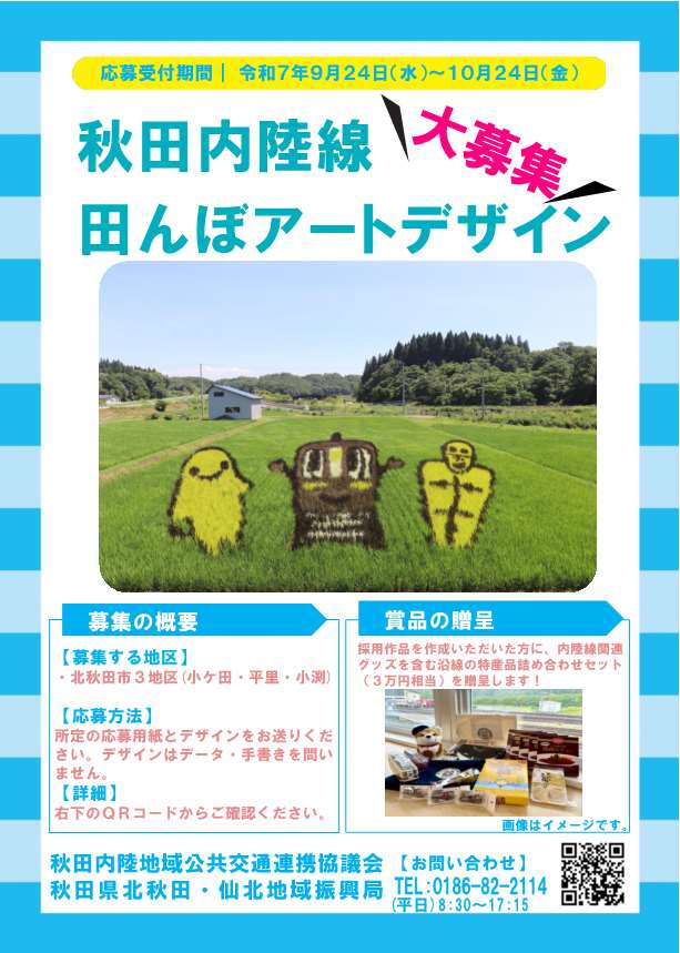 このたび、秋田内陸線により愛着を持っていただくため、令和8(2026)年度に沿線3か所で制作する絵柄のデザイン案を募集します。なお、田んぼアートに適したデザインとするため、採用作品を編集・加工する場合があります。
