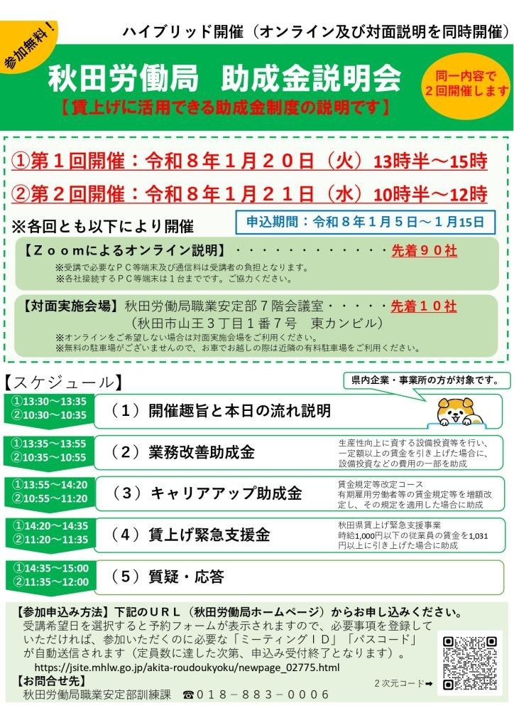 ※「秋田労働局 助成金説明会」のご案内を追加しました。県の「賃上げ緊急支援金」についても詳しく解説されますので、ぜひご参加ください(2025年12月24日)。⇐NEW‼