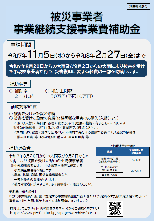 令和7年8月20日からの大雨及び同年9月2日からの大雨により被害を受けた小規模事業者が行う、災害復旧に要する経費の一部を助成します。