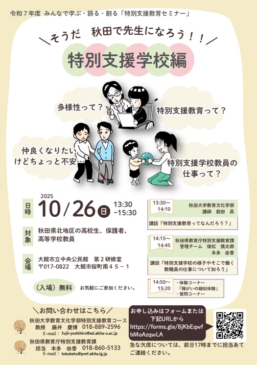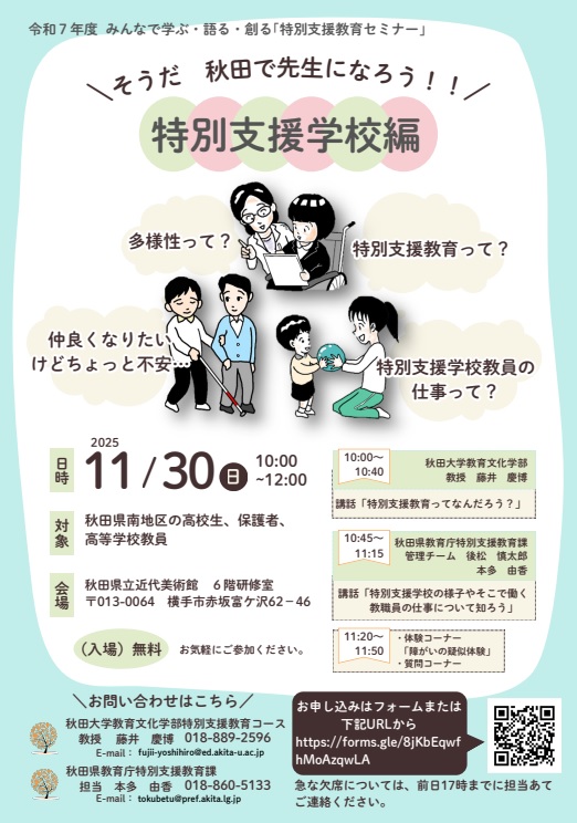 特別支援教育課では、秋田大学との共催により、高校生、保護者、高等学校教職員を対象として「特別支援教育」や「様々な障害」、「多様性」に関する理解を深める機会を設け、将来教員を志す、若き人材を育成・発掘するセミナーを開催します。