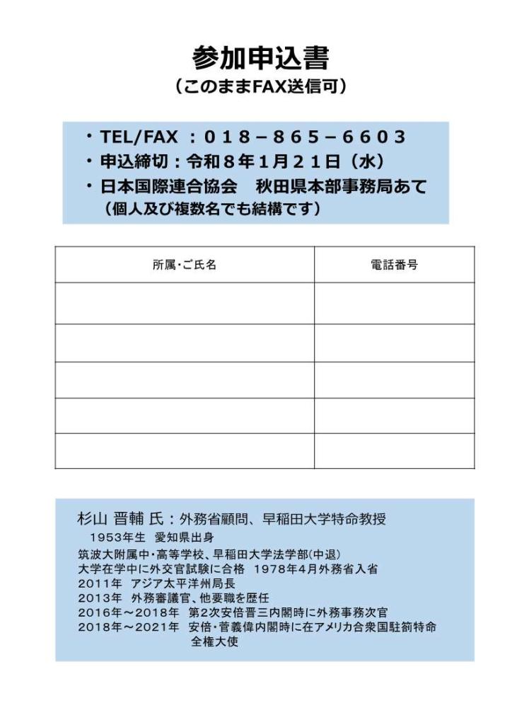 日本国際連合秋田県本部主催の講演会が外務省顧問・元駐米大使 杉山 晋輔 氏を講師に迎えて開催されます。
