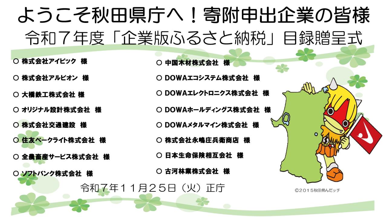 令和7年11月25日には、県正庁において、県が実施する事業に寄附の申出をいただいた県外企業の皆様から、神部副知事に目録が贈呈されました。