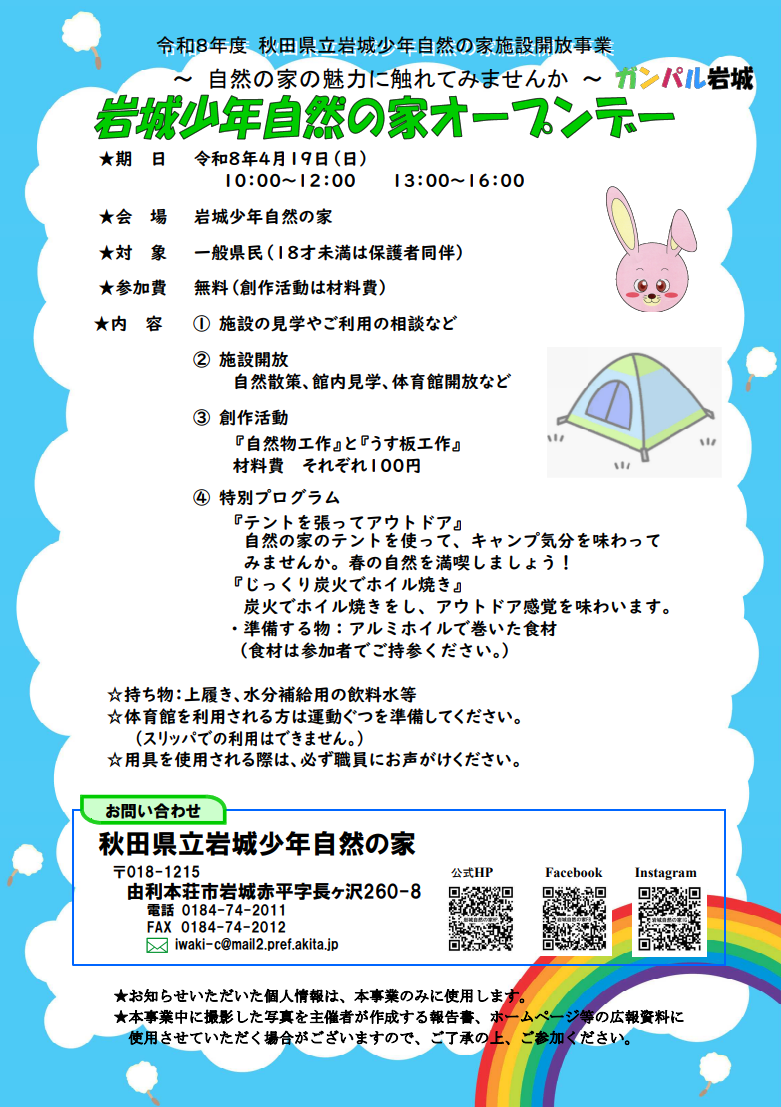 4/19(日)4月のオープンデー コンテンツ番号:93481 更新日:2026年03月15日 施設開放事業「オープンデー(4月)」 岩城少年自然の家の施設機能等を紹介する事業です。詳しくは次の「開催要項」「チラシ」ファイルをダウンロードしてご確認ください。事前申し込みは不要です。たくさんの皆様の利用をお待ちしております。 ダウンロード 開催要項 チラシ