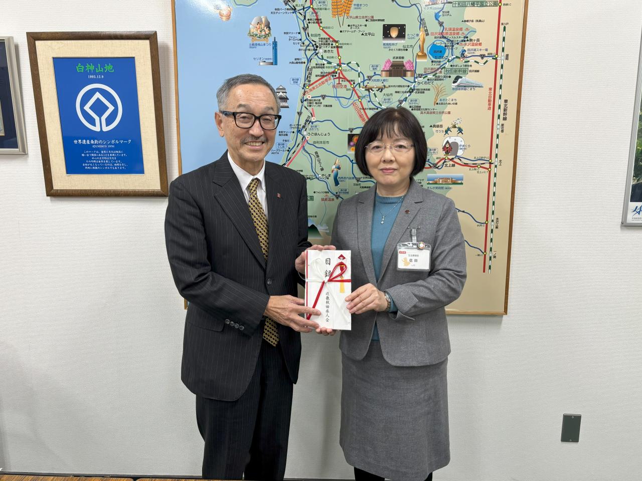 令和7年1月16日金曜日、近畿秋田県人会会長の加藤俊勝様からツキノワグマ被害防止対策への寄附金の贈呈がありました。
