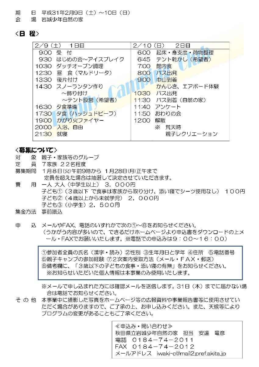 申込内容:(1)参加者全員の氏名(漢字・読み)(2)性別 (3)生年月日(子どもは