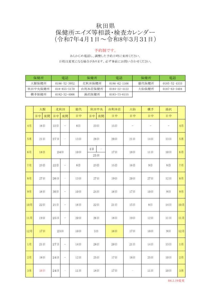 県内の各保健所(秋田市保健所を含む)では、HIV・エイズに関する検査、および電話や面接による相談を(無料・匿名)で行っています。