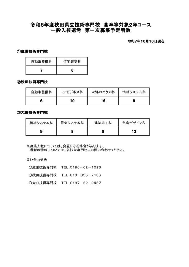 ◆秋田技術専門校:自動車整備科、ICTビジネス科、メカトロニクス科、情報システム科:定員各20名