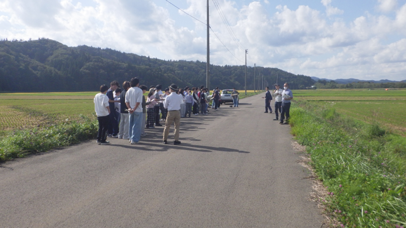 令和7年9月26日 金曜日 、秋田県立大学アグリビジネス学科1,2年生の54名が、農業生産基盤や農村の環境保全を支える技術を理解することを目的に、北秋田市内の農業水利施設及び区画整理後のほ場の現地研修を行いました。