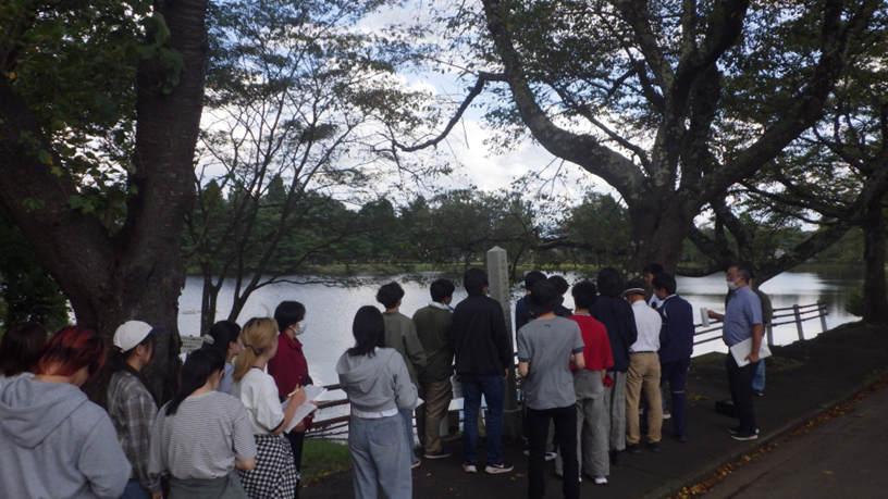 最後に、令和6年度より工事が始まった「堂ヶ岱大堤ため池」を見学しました。 ため池は農業用水の確保を主な機能とし、他に地域防災や生態系の保全といった多面的な機能を有してます。 本ため池も、下流にあるほ場に農業用水の供給を行っていますが、洪水時には溢水や堤体が決壊するおそれがあるため早期の改修を目指しています。学生たちはため池を改修する重要性について学びました。